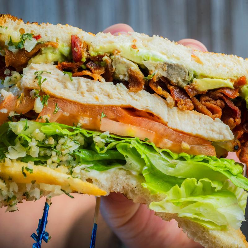 Chicken, lettuce, tomato, bacon, avocado, and mayo on sliced sourdough