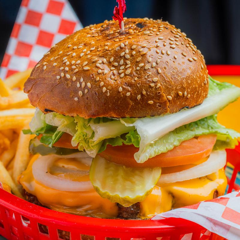 1/2 lb all Harris ranch beef topped with grilled onions, Cheddar, and tomato on sliced sourdough with 1000 island dressing