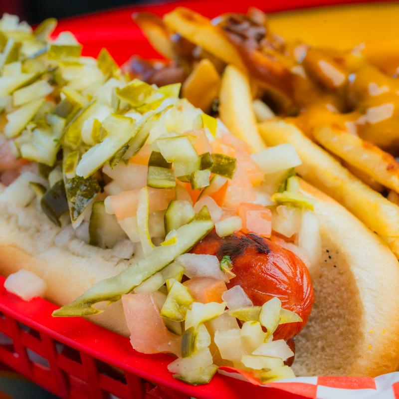 All-beef hot dog on a bun with chili, cheese, and onion