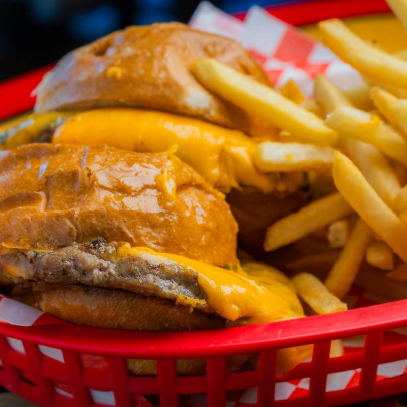 Two mini burgers with a choice of French fries or spring mix salad on the side